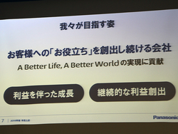 「お客様へのお役立ちを創出する会社であることが、パナソニックの目指す姿。お客様へのお役立ちを提供した報酬として利益があると思っている。つまりお客様へのお役立ちを創出し続けることが、利益の継続的な創出を意味する。中期的に目指すのは利益成長であり、売上げはその1つの方法である」(津賀氏)。