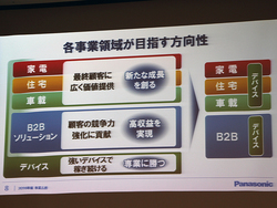 続いて津賀氏は、グループ内における事業領域の見直しについて説明した。これまでは「家電」「住宅」「車載」「BtoBソリューション」「デバイス」という5つで考えていたが、今後は新たな成長を作る「家電/住宅/車載」と、高収益を実現する「BtoB」に分けて考え、「デバイス」に関しては各事業部それぞれで該当する部分を担い、専業メーカーに対抗していく。