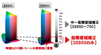 色補正処理も進化させ、暗部の表現力色補正処理を拡大。従来モデルからの中〜高輝度の明るさにおける色の補正に加えて、低輝度における色の補正も行うようになった。これにより、映画における暗いシーンを色鮮やかに再現したり、業務用モニターに迫る忠実な色再現を行うことができるとしている。