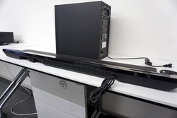 【SPEC】●実用最大出力:最大400W(75W×2+35W×2+25W×2+130W) ●使用ユニット:フロント…14mmソフトドーム型トゥイーター×2/60mmコーン型ウーファー、サブウーファー…160mmコーン型 ●接続端子:HDMI×4、D4×1、ビデオ入力×1、光デジタル音声入力×1、アナログ音声入力×1、USB、LAN ●Bluetooth対応コーデック:LDAC/SBC/AAC ●消費電力:バースピーカー…約50W、サブウーファー…約25W(ともに待機時 最小0.5W) ●外形寸法:1,080W×64H×127Dmm(グリル装着、壁掛け用ブラケット非装着時)、サブウーファー…約190W×382H×386Dmm ●質量:バースピーカー…約3.2kg、サブウーファー…約8.1kg