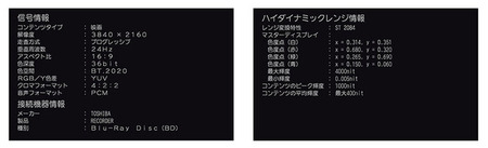 画面には、入力映像に付加された「信号情報」と「ハイダイナミックレンジ情報」をオンスクリーン表示できる。「信号情報」では、コンテンツタイプ/解像度/走査方式/垂直周波数/色深度/色空間/RGB/Y色差/クロマフォーマット/音声フォーマットを確認可能。「ハイダイナミックレンジ情報」では、レンジ変換特性/マスターディスプレイ/色度点(白/赤/緑/青)/最大輝度/最小輝度/コンテンツのピーク輝度/コンテンツの平均輝度が確認できる。なお、表示項目はHDMI入力時とメディアプレーヤー再生時で異なり、後者では、コンテンツタイプ/色空間/コンテンツのピーク輝度/コンテンツの平均輝度は表示されない。