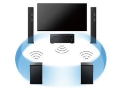 「ワイヤレスサラウンド」は、4月7日発表のサウンドバー「HT-NT5」から採用された新機能で、10月にアップデートによって対応予定。“h.ear go”など、ワイヤレスサラウンド対応スピーカー2台(別売)をリアスピーカーとしてワイヤレスで接続し、リアルサラウンドを構築できる。