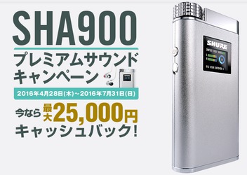シュア・ジャパンは、同社初のポータブルヘッドホンアンプ「SHA900」を購入したユーザーが対象のキャッシュバックキャンペーンを実施する。