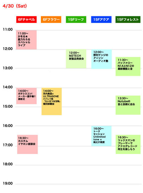 とにかくイベントが盛りだくさんな2日間。音楽フェスのようなタイムテーブルにまとめてみたので活用してもらえると幸いだ。なお、NOKKO/GOH HOTODA夫妻のトークイベント、野村ケンジのたのしいハイレゾ Special Talk Show&ポタシスコン!ユーザー選手権!!、河内美里×ULTRASONE ハイレゾ版「たいせつな宝物」個別試聴会の3イベントは入場に際して整理券などが必要。入場条件の詳細を公式サイトでチェックしておこう。