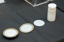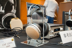 ブースでは、開発を担当しているオンキヨー(株)の藤井貴哉氏にその詳細を伺うことができた。今回出展されたプロトタイプは、本ヘッドホンの中心技術であるセルロースナノファイバー振動板によるドライバー、および「桐」素材のイヤーカップを、仮に従来モデルのフレームに装着したものだという。