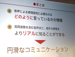 今回の発表会では、ゲストで登場した青山学院大学 教育人間学部 教授 重野純氏が、人間のコミュニケーションにおける音声の重要性を解説する一幕も。重野氏によれば、人は会話のコミュニケーションにおいて、「言葉自体の意味(言語情報)」よりもそれを「どのように言ったか(非言語情報)」という感情的な意味合いの方を重視する傾向があるという。また、日本語は持続時間が長い母音が多く用いられる言語でもあり、特に日本人は音声から感じ取れる感情に敏感であるという研究結果が紹介された。