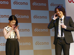 今回の発表会には、ドコモの広告に登場する俳優・綾野剛さんと女優・高畑充希さんも登場した。ステージでは、「スグ電」を使う綾野さんと通常の通話発信機能を使う高畑さんが、どちらが早く加藤社長に電話をかけられるかを競う一幕も。結果は、「スグ電」を使った綾野さんの勝利だった。