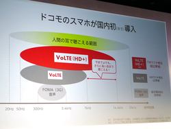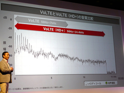 加藤氏は「VoLTE(HD+)」の音声品質を、「FOMAは固定電話、従来のVoLTEはAMラジオ、VoLTE(HD+)はFMラジオ」と表現した。