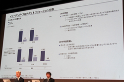 IP&S分野については、デジタルカメラや放送用機器などの大幅な減収により、売上高5,300億円(前年度比-22.5%)、営業利益160億円(前年度比-533億円)を見込む。この減収・減益には、熊本地震の影響で部品調達が遅れることによる売上の減少が含まれている。