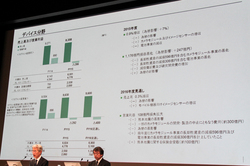 デバイス分野については、売上高9,600億円(前年度比-0.3%)、営業損失400億円(前年度比-108億円)を見込む。売上高についてはモバイル機器向けイメージセンサーの増収があるものの、主に為替の影響により全体ではほぼ前年並みに。営業損失については熊本地震による影響や、一部のカメラモジュールの開発・製造中止に伴う費用発生、為替の悪影響により、損失拡大を予想している。