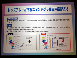 インテグラル方式とは、複数のカメラ映像を用いる多視点画像から立体像を生成することで、3Dメガネなしの裸眼3Dを実現させるというもの。NHKでは数年来の研究を続けているが、今回、複数のプロジェクターをレンズアレイ上に重ねて投写する立体表示方式を開発し、立体像の解像度や視域を向上させたほか、2.8型高精細ELディスプレイを用いたデモ展示も行っている。
