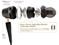 φ13mm振動板と純鉄ヨークを採用した2つのダイナミック型ドライバーを対向配置し、2つのドライバーを逆位相で駆動させることで、効率良く磁気を伝達しハイレゾ音源も極致まで描き出すという「DUAL PHASE PUSH-PULL〈Hi-Res Audio〉DRIVERS」を搭載。