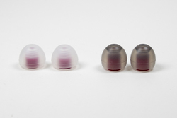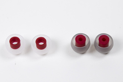 閑話休題。本誌特別付録のSpinFitの試供品は、傘の部分のサイズは一般的なMサイズ1種ですが、様々なイヤホンで使えるように、ノズルのサイズを2種類用意しました。ひとつは、シュアのSEシリーズなど、ノズル径が約3.3mmのイヤホンに最適です。もうひとつは茶楽音人の「Donguri」など、ノズル径が4.5〜5.5mmのイヤホンに対応しますので、幅広いモデルに対応できます。