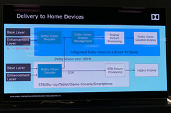 「ドルビービジョンでは2つのレイヤーを同時デコードしないとならず、4K/60p映像の場合、HEVCデコーダーが2つ必要になる。規格上60pまでサポートすることになっているので、デコーダーを2基搭載せねばならないのが開発のコスト面での負担になる。しかし映画の場合はほとんどが24pなので、デコーダー1基でも2レイヤーを時分割で再生できる。動画配信サイトが先行してドルビービジョン対応できたのはそのためだ。ただ最終的にはメーカーが決めることで、製品がどういうかたちになるかは我々がコメントする立場にない」(真野氏)とした、なお、「ドルビービジョン対応プレーヤーが出ると同時にコンテンツも出るはず」とも語られた。