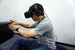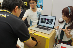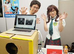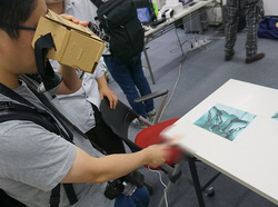 そのほか、女性の胸部をかたどったゴム製の模型も置かれており、その部分だけは実写で、それ以外はCGキャラというデモも体験できた。つまり、ゴーグルを通して見ているCGキャラの胸部に手を近づけて触ると、本物に近い感触が得られるということになる。開発者は「考えつきそうだけど、これまであまりやられていなかった方法」と胸を張っていた。
