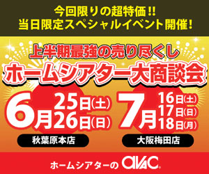 アバックは、最新のAVシステムの体験や特価購入ができるイベント「アバック ホームシアター大商談会SUMMER」を秋葉原本店と大阪梅田店の2会場で開催する。入場は無料。