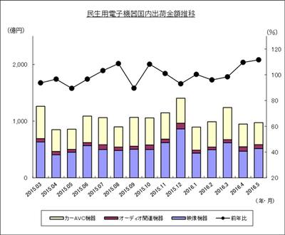 JEITA(一般社団法人 電子情報技術産業協会)は、2016年5月の民生用電子機器国内出荷実績を発表した。