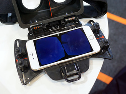 インフォマティクスは、同社が取り扱うカールツァイス社製のVRヘッドマウント「VR ONE」を使って、アプリ開発を始めとしたVRソリューションをデモ。iPhone6/6s専用である「VR ONE」の新モデルとして、iPhone 6 Plus/6s Plusにも対応する「VR ONE Plus」が秋ごろに登場予定であることも予告していた。