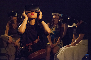 入場チケットは日時が細かく指定され整理番号も付いており、指定日時に会場に向かうと、普段は入ることのできない奥まった薄暗い部屋に通される。VRを一度に体験できる人数は最大25名。使用されるのは、サムスンのVRヘッドセット「Gear VR」と、B&Wのヘッドホン「P5S2」だ。