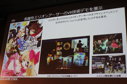 スクウェア・エニックスからは、第10ビジネス・ディビジョン プロデューサー 加島直弥氏が登場。モバイルゲーム「乖離性ミリオンアーサー」の3Dバトル部分をVR化し、イベントに展示したことに言及し、「お客様からの反応がすごかった」ことで可能性を強く感じたという。Viveについては「よかったのはコントローラーがあって、手がトラッキングできること。一見当たり前のようだが、VR内に手があるだけで没入感が高まる。乖離性ミリオンアーサーでは、目の前のカードを選択する場面があるが、今まではスマホをタップして選択していた。Viveを使用することで、実際に自分の手でカードを選択している感覚が体験でき、自分が主人公になった感覚が味わえたことでより楽しんでもらえた」と述べた。