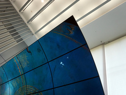 今回DNP五反田ビルに導入されたのは、フルHDの曲面有機ELディスプレイを24面使った約225型/解像度7,680×6,480のデジタルサイネージシステム。パネルの輝度は400カンデラで、1枚あたりの質量は約1.9kg。パネル自体の薄さは0.97mmで、クレジットカードをはじめとする一般的なカード類の平均0.84mmに迫る薄さを実現している。