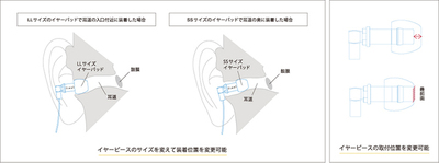 イヤーチップのサイズを変えて耳の奥や入口付近など装着位置を変更したり、取付位置を最前面に変更することが可能で、これにより装着感と遮音性を高め、よりダイレクトで生々しい音楽再生を狙っている。