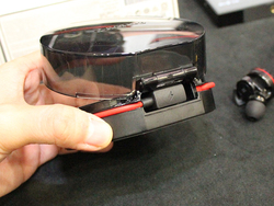 円形デザインの充電用キャリングケースは、USB経由で蓄電を行うタイプで、イヤホン本体に最大約5回の充電が行えるとのこと。蓄電機能を使わないときは、USBケーブルをケースの外側に巻き付けて収納できる。