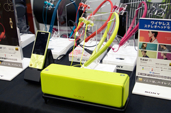 ポタフェスには3回目の出展となるソニーは、今回「もっと気軽にBluetooth対応機器を楽しんでもらいたい」というテーマで、h.earシリーズのワイヤレスヘッドホン「MDR-100ABN」/イヤホン「MDR-EX750BT」や、ポータブルスピーカーをメインに展示していた。