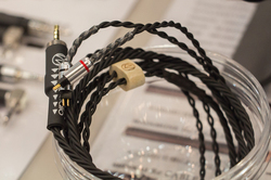 ハイエンドクラスのリケーブルを手がけるBrise Audioは、新イヤホンケーブル「UPG001」を披露した。本機は銀コートを施さない高純度銅をベースとした新ケーブルを採用。導体径は従来より太くしつつ、絶縁被覆を薄くすることでケーブル径を従来より細くしたことで取り回しの良さも兼ね備えるという。MMCXタイプ、2pinタイプ、4極2.5mm端子モデルなど多数のバリエーションも用意している。