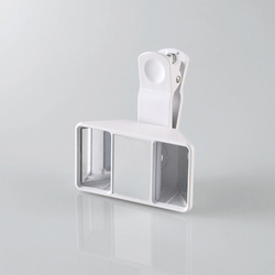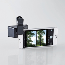 スマートフォンのカメラレンズに取り付けてVR用3D動画の撮影ができる3D撮影レンズ。左右の目の視差に基づいて画面を左右に分割した動画を撮影できる。