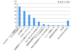音楽を聴くためにこの一年間に利用したものは、1位が「YouTube・ニコニコ動画などのサービスを利用した(51.9%)」で最多。続いて2位「CDを購入した(39.7%)」、3位「CDをレンタルした(29.6%)」という結果となった。