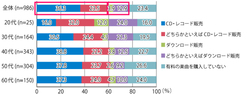 年代別でみると、若い年代ほど「ダウンロード販売」の利用率は高いものの、依然として「CD・レコード販売派」が多い。同社では、「アルバムの中の一曲のみダウンロードするなど、使い分けているのかもしれない」と分析している。