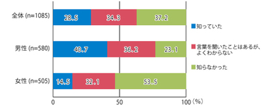 男女別で見てみると男性は「知っている」と答えた人が40.7%と最も多く、「言葉を聞いたことはあるが、よくわからない」の36.2%と合わせると、76.9%の人に認知されていた。一方で女性は、「知らなかった」と答えた人が53.5%と半数以上で最も多く、男女による認知率に大きな差があらわれた。