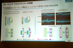 井上氏は「ダイナミックドライバーは構造上、どうしても音が歪んでしまう。また一般的な平面方式もエッジがあるため、多少は振動板が湾曲して歪みが出る。エッジレスであるフローティングフラットドライバーはそれがない」とアピールした。