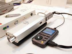 「SPDIF iPurifier」は、その名の通りiPurifierシリーズのSPDIF端子用モデル。「価格や発売日はまだ決まっていない」(同社スタッフ)とのことだったが、「駆動には電源を使用するのだが、ポタ研ということで、モバイルバッテリーを使って駆動させている」という少し変わった方法で、「micro iDSD」およびLotoo「PAW5000」と組み合わせてのデモも行っていた。