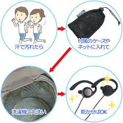 本機は、「水深1m以下の深さに水没しても、30分までなら内部に浸水しない」という防水等級IPX7を取得していることが特徴のイヤホン。汗などで汚れた場合は、手洗いはもちろん、付属のケースか洗濯用ネットに入れれば洗濯機で洗濯することもできるとのことだ。