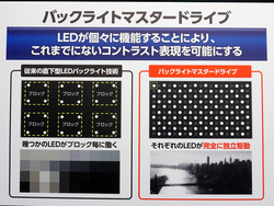 新技術「バックライトマスタードライブ」では、従来の直下型LEDバックライトよりも大幅に高密度でLEDを実装し、各LEDをすべて独立して緻密に制御。いくつかのLEDがゾーンを構成してまとめて制御される従来の直下型バックライトに比べ、LEDのエリア駆動を従来よりも細かく行うことができる。