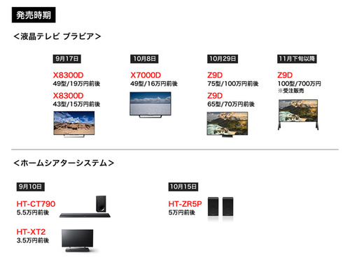 まず今回発表されたのは、4Kブラビアが「Z9D」「X8300D」「X7000D」の3シリーズで、すべてAndroid OSを採用。ホームシアターシステムサウンドバー「HT-CT790」、ボードタイプの「HT-TX2」、ワイヤレスの2chアクティブスピーカー「HT-ZR5P」の3製品。それぞれを発売日順に並べたのが下記の図だ。