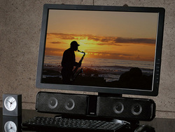本製品は、32インチ〜24インチの液晶ディスプレイ下部に設置可能で、幅の少ないデスクや棚の上でも使用できることが特徴。付属の2パターンのオプションスタンドにより、様々な形状のディスプレイスタンドに対応する。