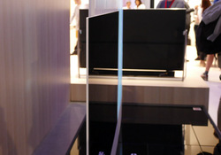 プロトタイプはディスプレイ部の薄さを強調した展示となっており、駆動回路などは下の台座内に置いている。