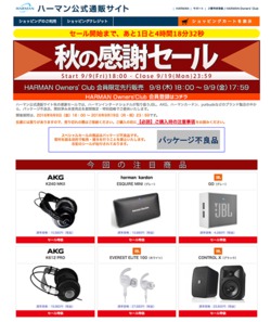 ハーマンインターナショナルの直販サイトにて、同社取扱製品が特価で購入できるスペシャルセールが9月9日(金)18時からスタートする。期間は9月19日(月)23:59まで。なおHARMAN Owners' Club会員には、1日早く9月8日(木)18時から先行販売が行われる。