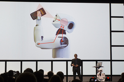 11時からの「Exponential Technology」のセッションでは、まずベルリン工科専門大学のManfred Hild博士が、未来の家庭内で活躍するロボットについて、ヒューマノイドロボット「MYON」とともにプレゼンテーションを実施。