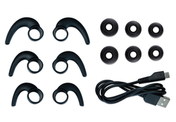 付属品にはシリコンイヤーチップ(S/M/L)、充電用USBケーブルのほか、スポーツイヤークッション(S/M/L)も付属。本機に取り付けることで、耳の凹みにしっかり収まり運動時にも外れにくく装着できるよう配慮している。