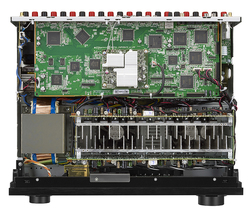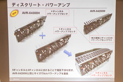 AVR-X4200Wは1枚の基板に7chパワーアンプを配置していたが、本機では4chパワーアンプ基板と5chパワーアンプ基板を組み合わせることで、筐体サイズはそのままに9chアンプ搭載を実現。2枚のアンプ基板を用いることで、相互干渉も防いでいるという。