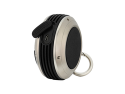 IP44相当の防沫仕様を備えたBluetoothスピーカー。直径90mm×45Hmmのコンパクトなボディに、50mm口径のフルレンジスピーカーを搭載し、出力は5Wとなる。さらにパッシブラジエーターも搭載し、低音再生能力も高めている。