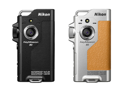 KeyMission 80は、付属のカメラホルダーから取り外すと自動で電源がオンになり、片手で素早く撮影できるモデル。KeyMission 360/170にも採用されているNIKKORレンズを搭載するメインカメラのほかに、有効画素数約492万画素のサブカメラを備え、自撮りにも対応する。本体カラーはブラック、シルバーの2色を用意。