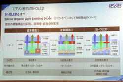 新ディスプレイ「Si-OLED」は、シリコンをベースとした有機発光ダイオード。自発光する白色OLEDを特定の波長に共振させることでR/G/Bの色を引き出し、それをカラーフィルターを使って補正。それを導光板に反射させ、映像を視界に投射する。パネルサイズは0.43型で、解像度1280×720。画面精細度は575ppiから3,415ppiとなり、滑らかな映像を実現。コントラスト比も前モデルが200対1だったのに比べ、10万対1と大幅に向上した。