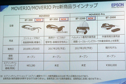 また、BT-300のBtoB向けモデル「BT-350」、および業務用ヘッドセット「BT-2200」も発表された。どちらも2017年2月発売予定で、価格はオープン。現行の業務用ヘッドセット「BT-2000」は併売されるため、同社のスマートグラスのラインナップは4製品となった。今後2年間で販売台数約5万台を予定。市場拡大を狙うという。