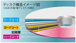 同社製の録画用BDディスクに採用している「トリプルタフコート」を採用することで、保存性能を高めていることも特徴だ。温湿度変化による反りに強い防湿層「ワープコート」、水分・化学物質の侵入を防ぐ保護層「ガードコート」、汚れ・指紋・傷・打痕に強いカバー層「ハードコート」の3層構造としている。
