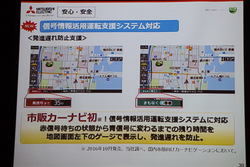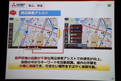 安心・安全機能については、音声認識機能に特に注力。車載向け音声認識の豊富な実績と同社の高い研究開発力が本機に活用して、音声認識機能を立ち上げることなく、会話の中からキーワードを自動認識してすばやく行き先を検索できるという「周辺検索アシスト機能」を実現した。同社は「信号待ちの10秒間で周辺検索ができる」と紹介している。
